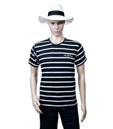 Elegante t-shirt in stile nautical da adulto in tessuto tinto filo rigato blu e bianco in finissimo cotone 100%, lavorata in Italia, con piccolo ricamo stilizzato sul lato cuore Amalfi Coast con bandiera tricolore italiana, con colletto in maglina mercerizzata in tinta.