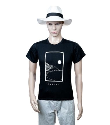 T-shirt in cotone 100% di colore nero, prodotta in Italia, che rappresenta il panorama notturno della nostra bellissima Amalfi, illuminata da una splendida luna,