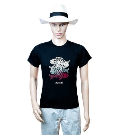 Questa bellissima t-shirt nera in cotone 100% con stampa pesci etnici e scritta Amalfi è davvero molto richiesta per il suo particolare stile.